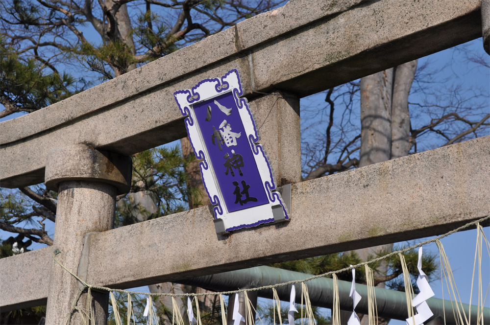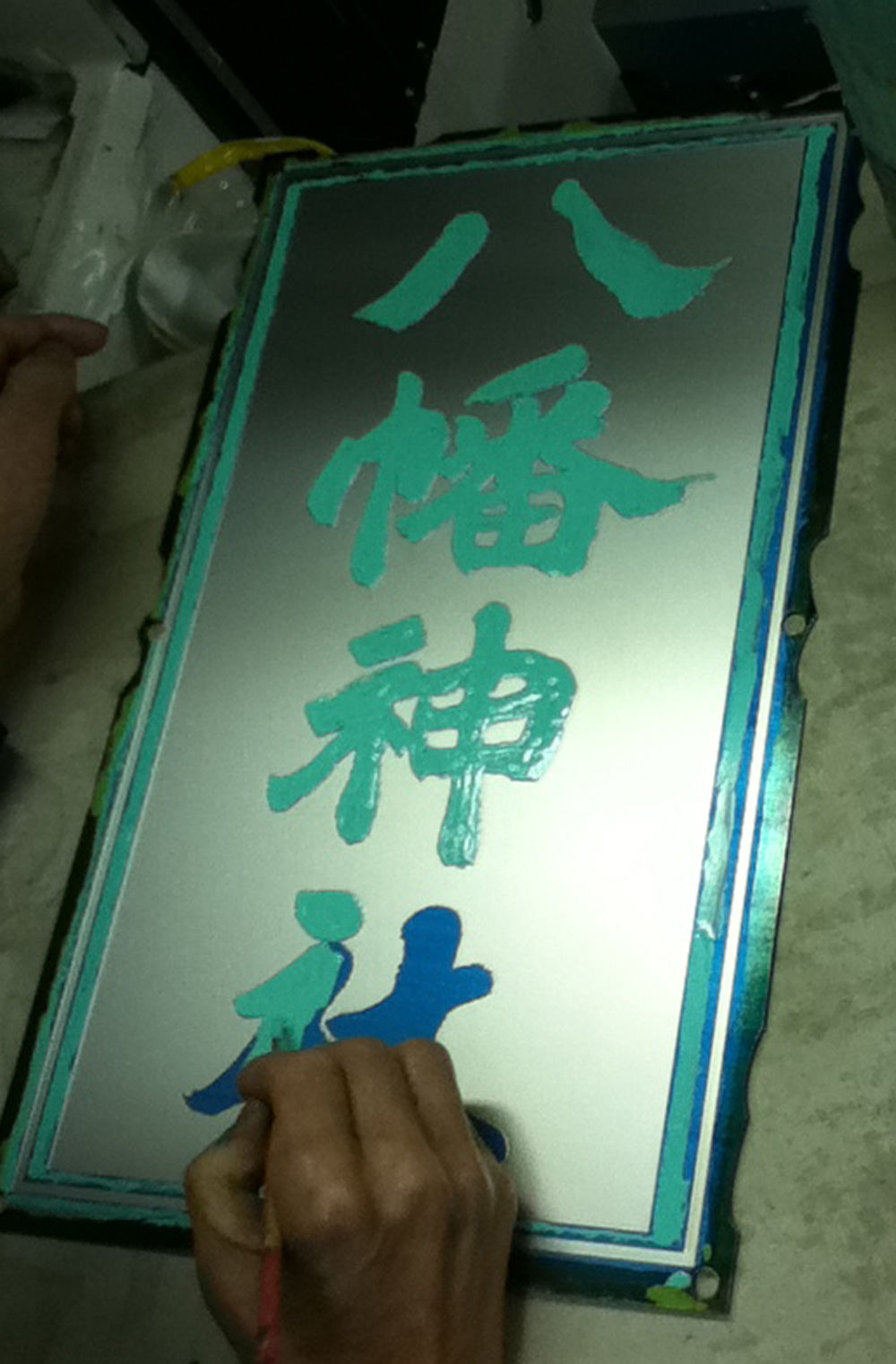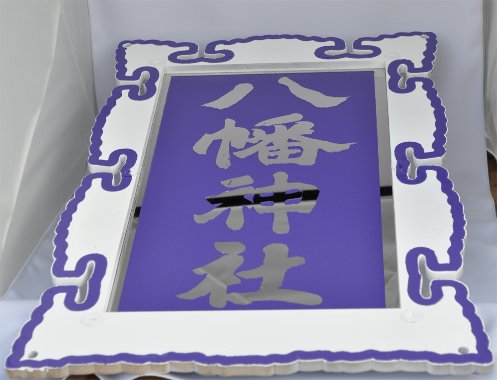 八幡様の文字は、ステンレスを磨いて光沢を出しました。文字以外の部分は、紫色の塗料と白い塗料を吹き付けして着色してあります。(弊社会長(71歳)作業)