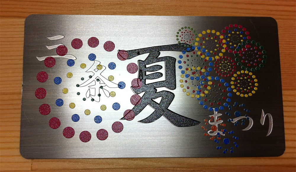 名刺大のSUS304の材料をエッチングして、最初に「三条」「夏」「まつり」の文字を掘り込みました。