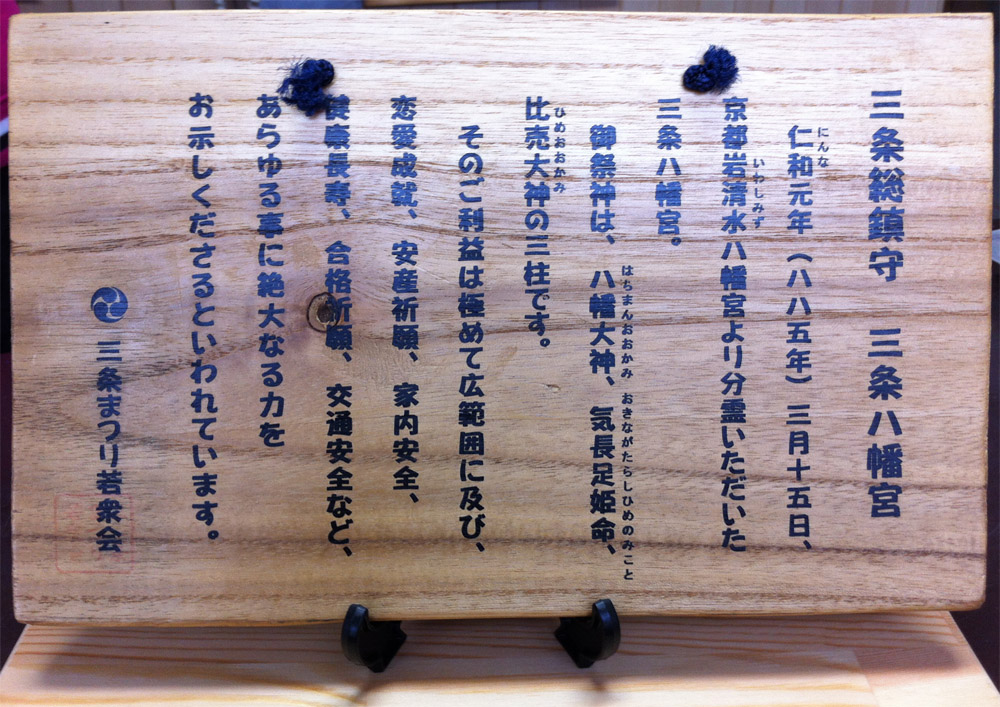 三条祭り若衆会で役員をしていた時に作成した看板です。サイズは、A4くらい。三条総鎮守である三条八幡宮のありがたいおみくじの説明書きです。本来は、ときたまさんぷるのネタになるようなものですが、急遽、毎月銘板に採用しました。